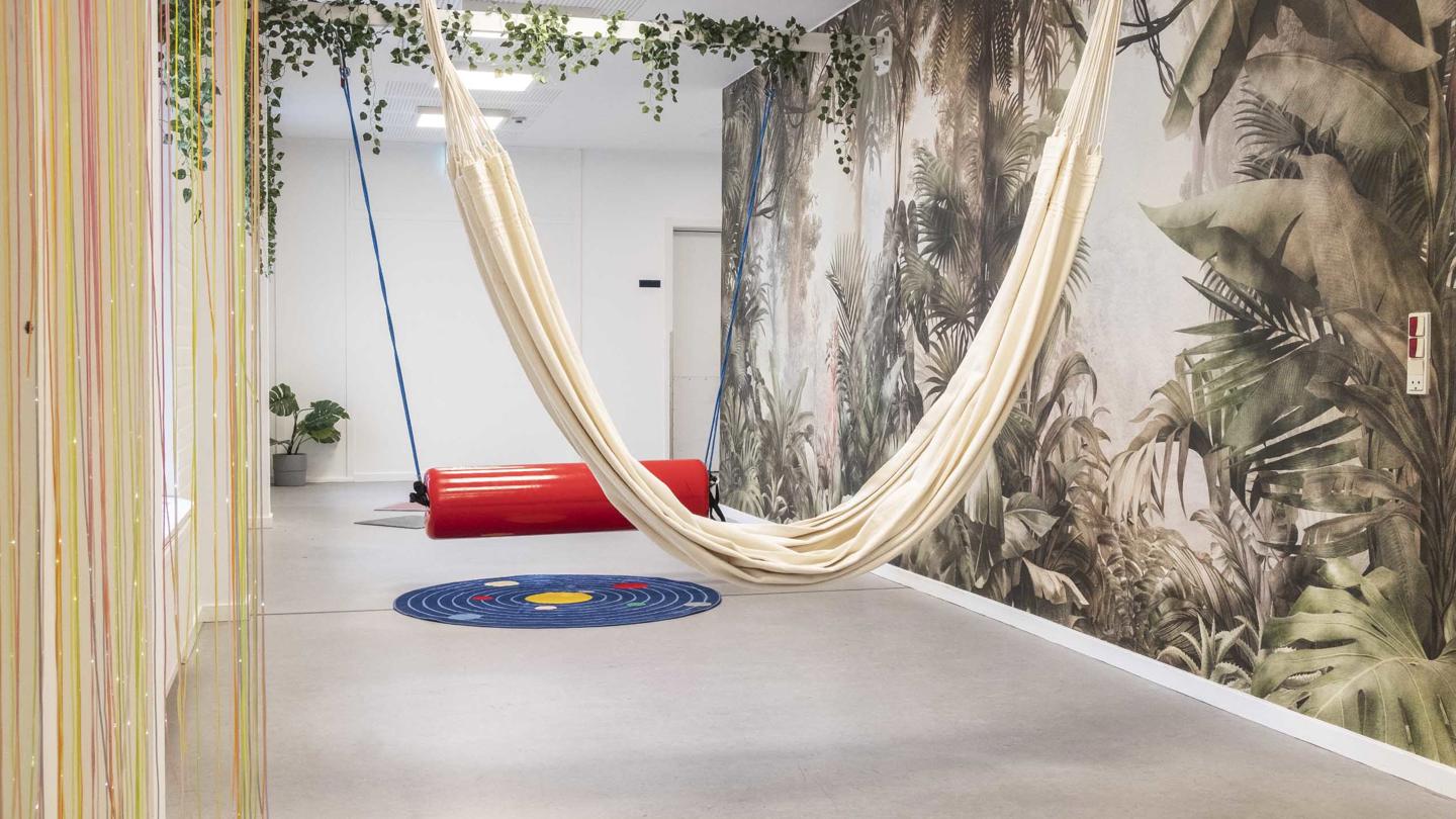 Midt i gangen hænger en pøllegynge og en hængekøje. Når du gynger, får du stimuleret og trænet din balancesans. Hvis du samtidig bruger fødderne til at skubbe dig frem og tilbage med, styrker og stimulerer du også din muskel-ledsans.
