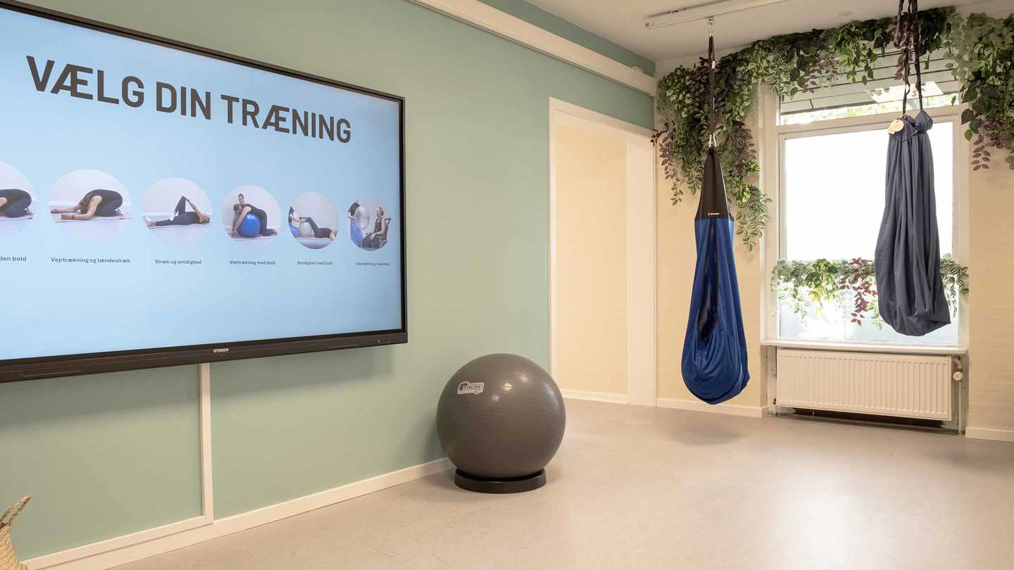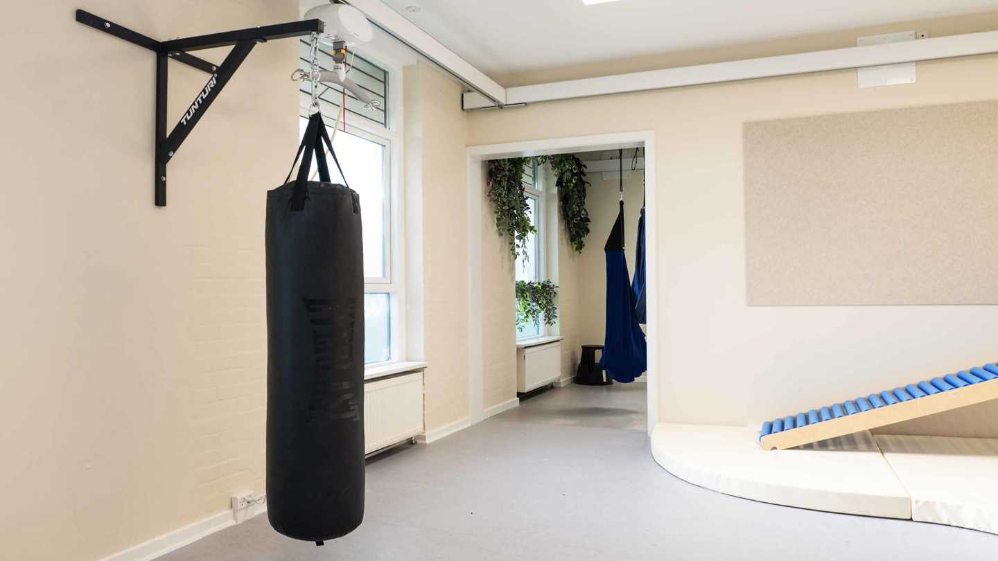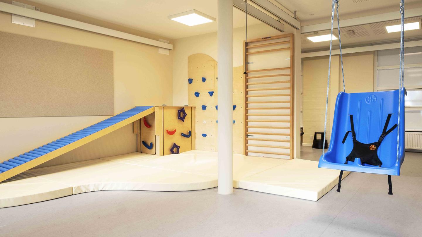 I rummet er der bl.a. en klatrevæg, rullerutsjebane, gynger, forskellige bolde og en boksebold, som du kan prøve kræfter med.